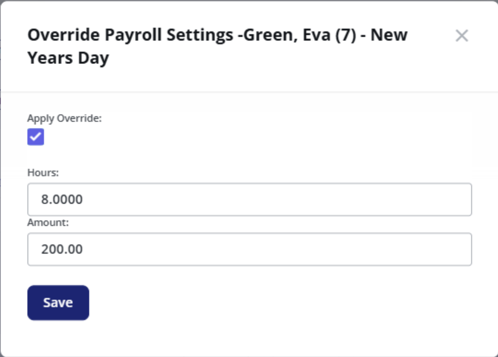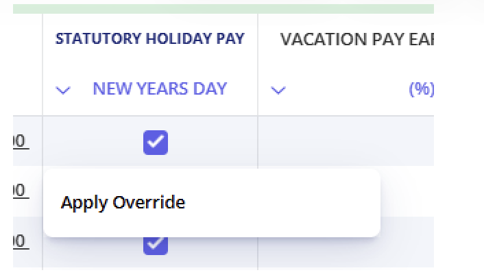 If the calculated stat pay doesn't look right for a specific employee, you can override it. Right-click the employee's stat pay cell on the input sheet and select Apply Override. You can then enter a different number of hours and dollar amount.
