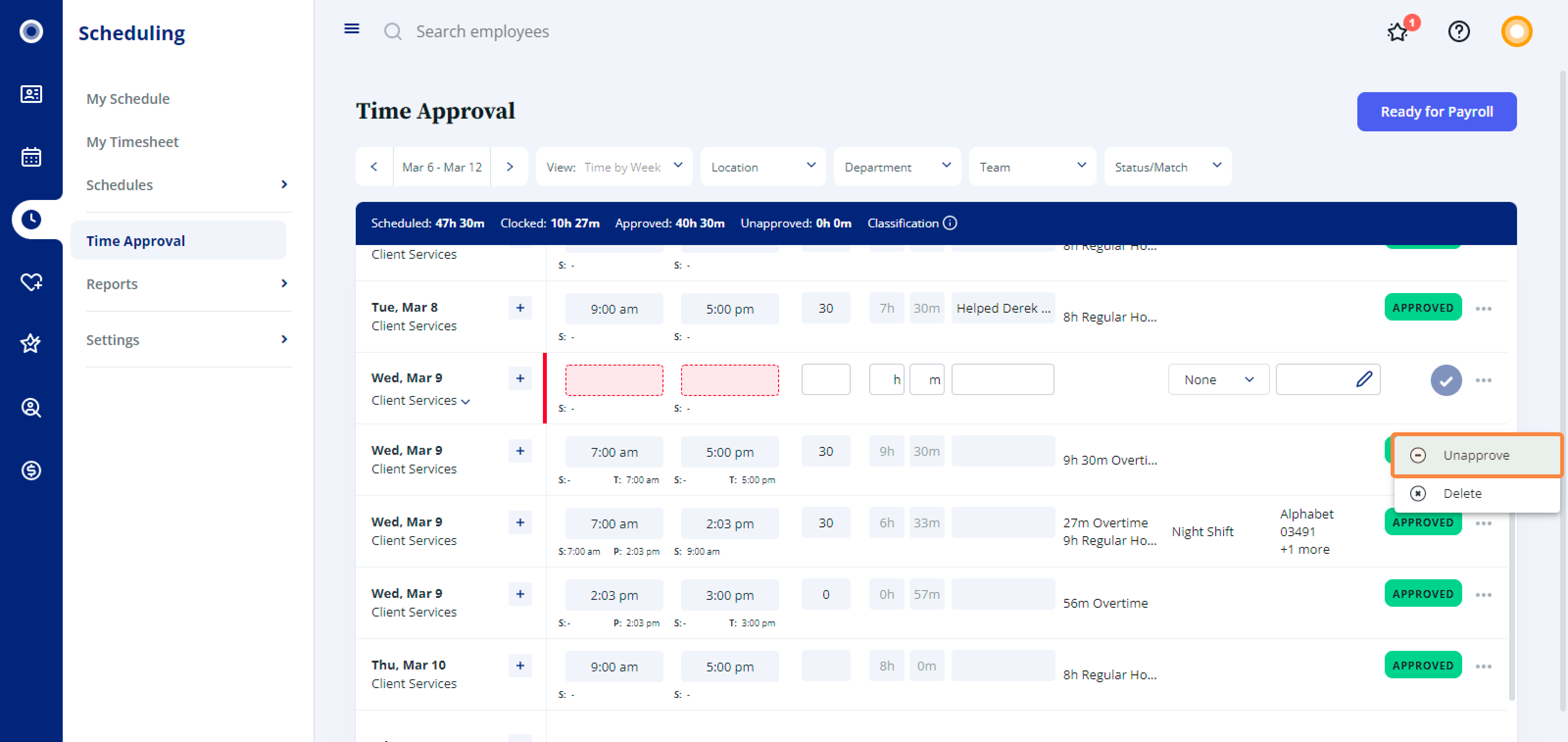1. In Scheduling, click Time Approval in the navigation menu on the left-hand side. 2. You'll be taken to Time Approval. To filter your view, use the filter menu at the top to narrow shifts down by date, location, department, or status/match. Your ...
