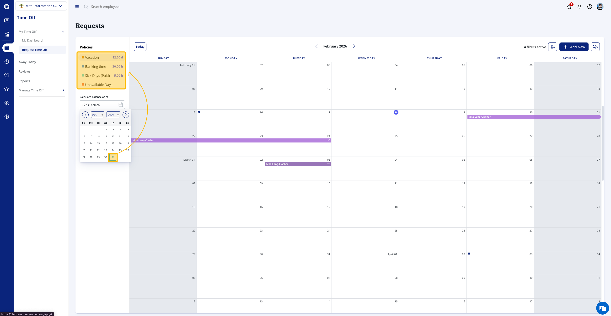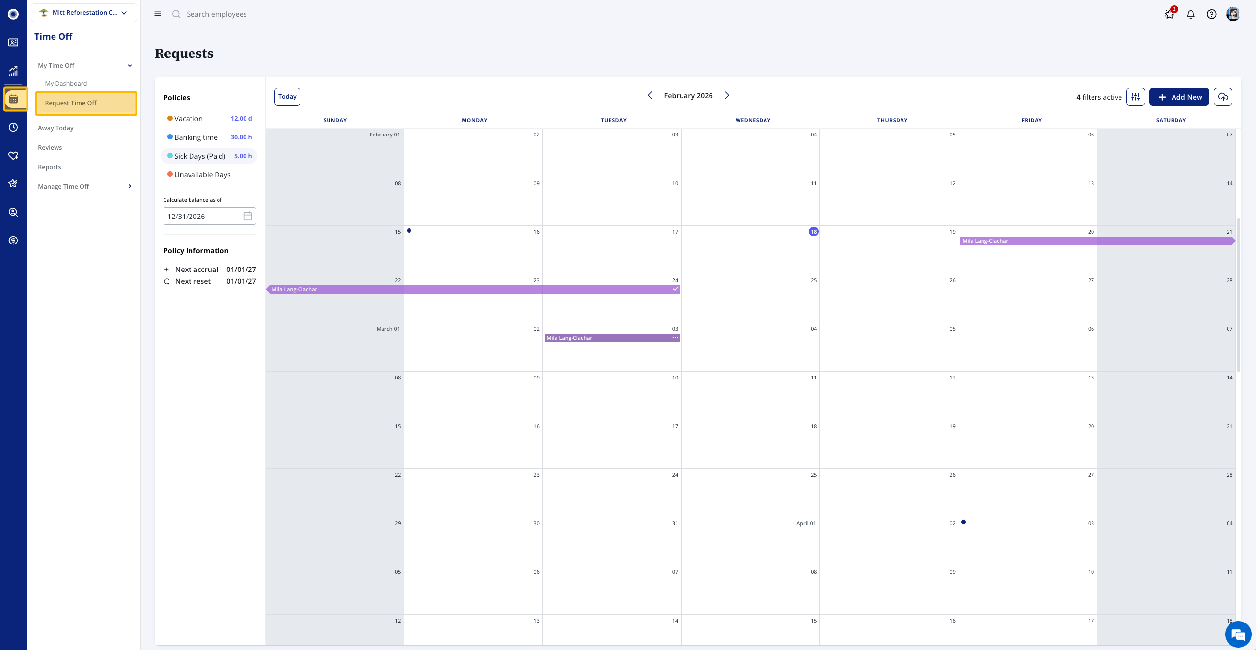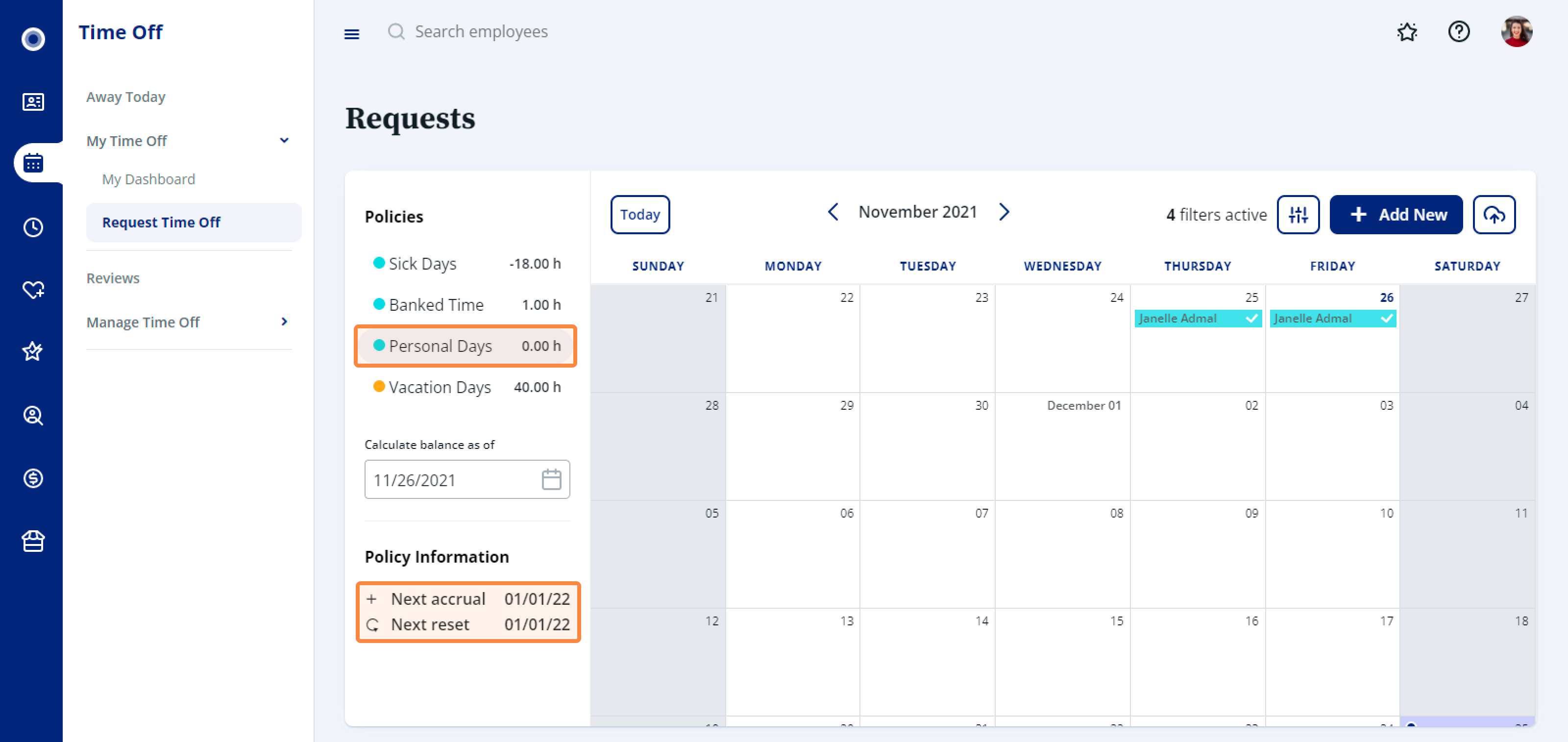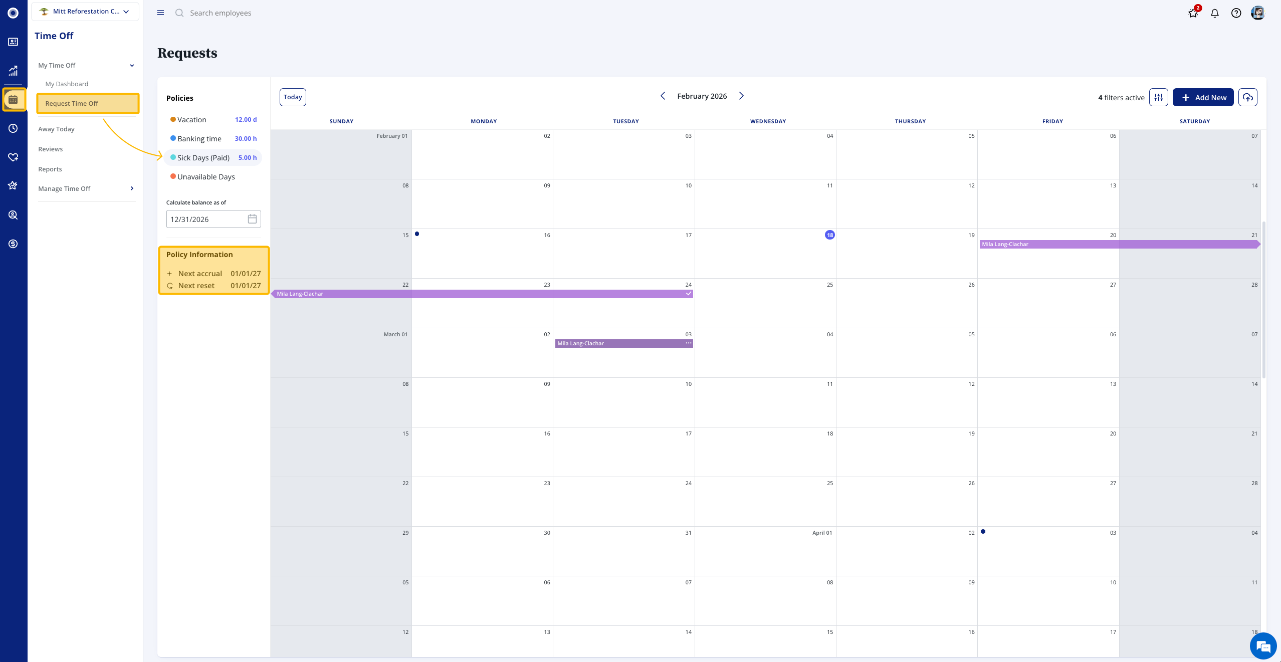 2. Click on a policy name to see its next accrual date. After this date, the policy's specified accrual will be added to your time off balance.