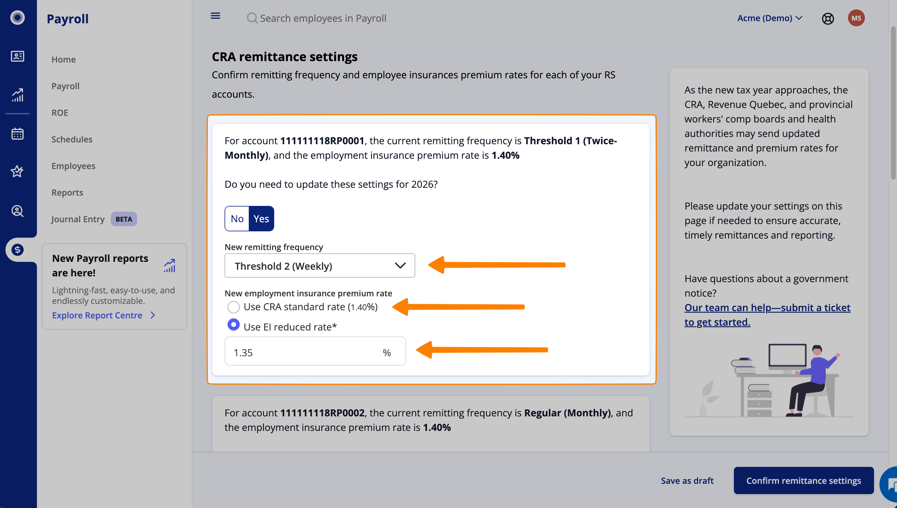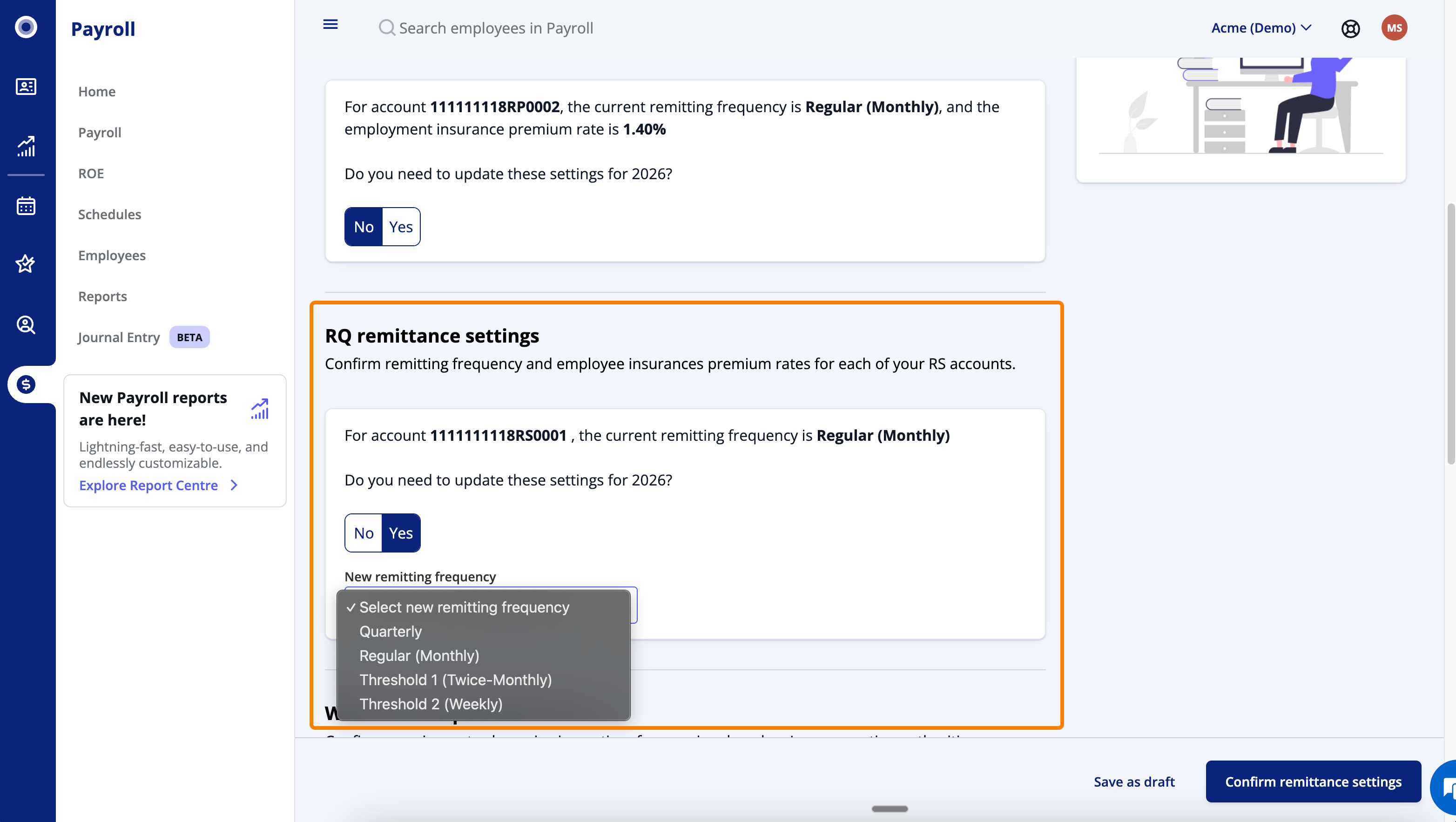 The system shows your current remitting frequency and Employment Insurance (EI) premium rate.