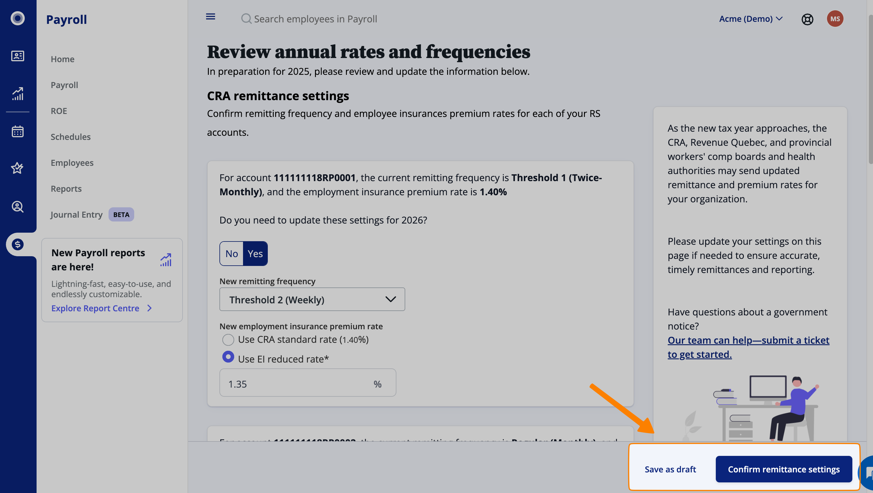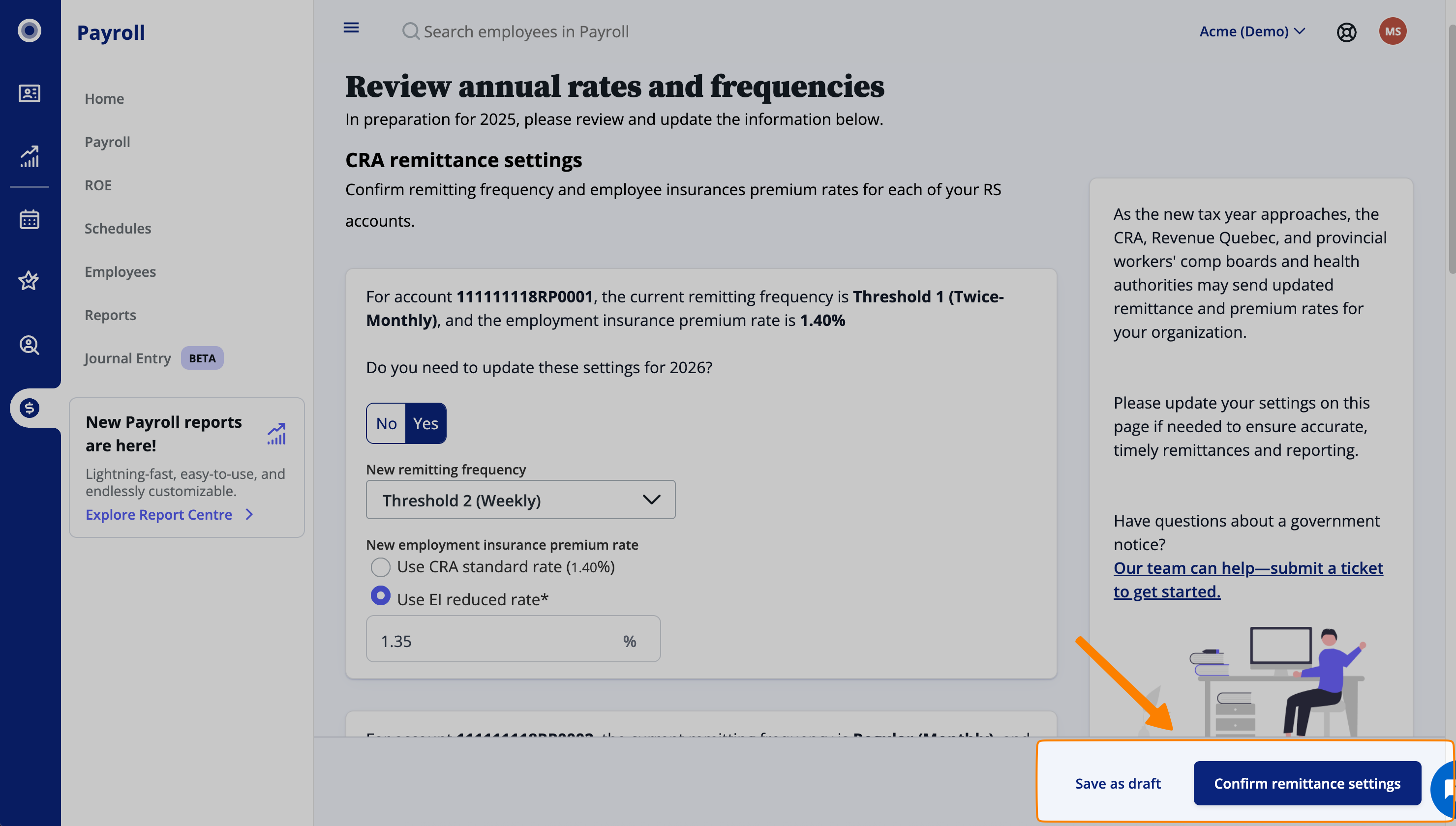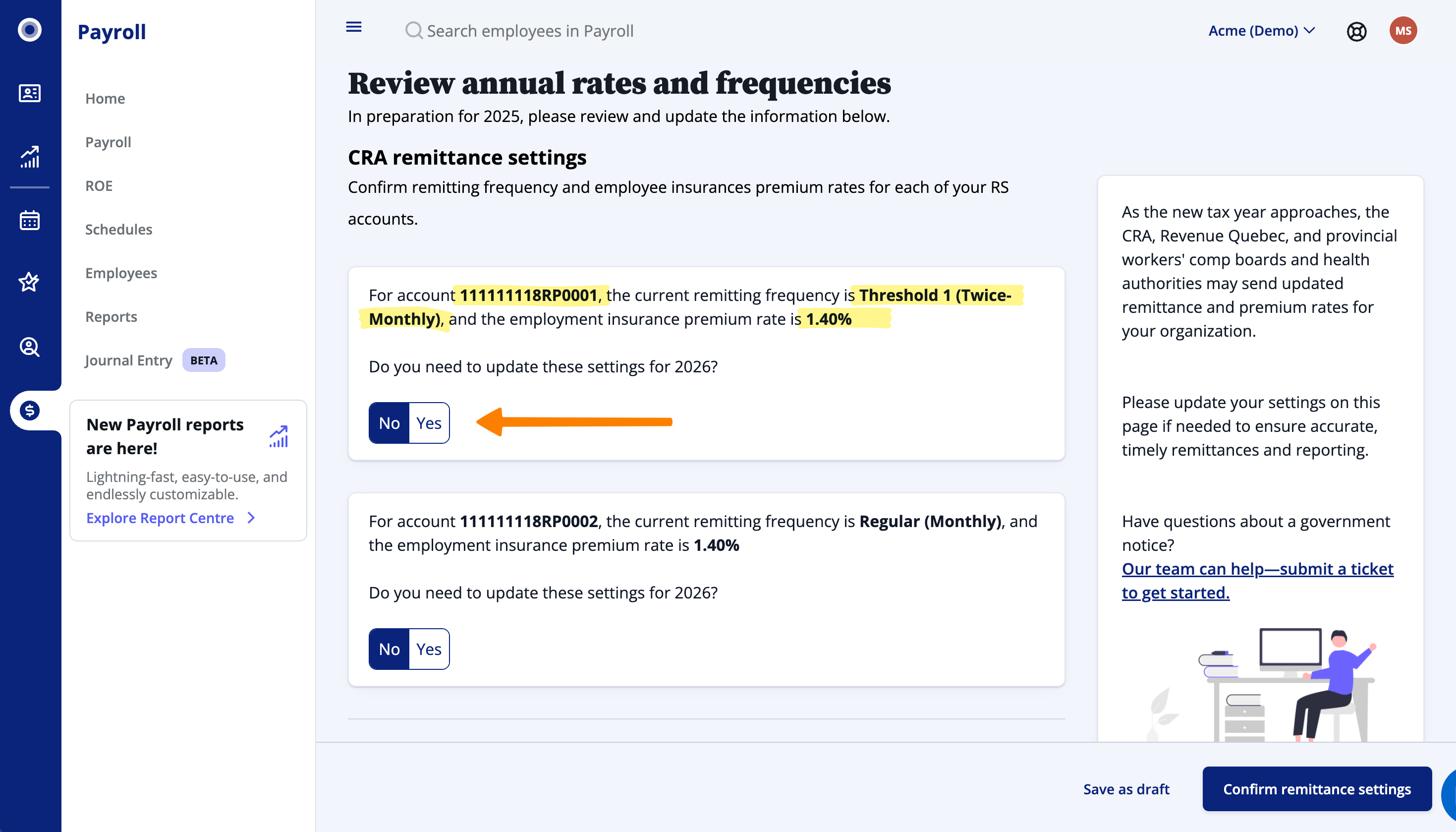 Important: These instructions apply only to updating remittance settings and contribution rates for the upcoming year during year-end closing. For mid-year changes, please contact support.After clicking “Review details,” you’ll be on the “Review annual rates and frequencies” page. This form is divided into sections based on your company’s setup (e.g., you won’t see Quebec sections if you don’t have employees there).