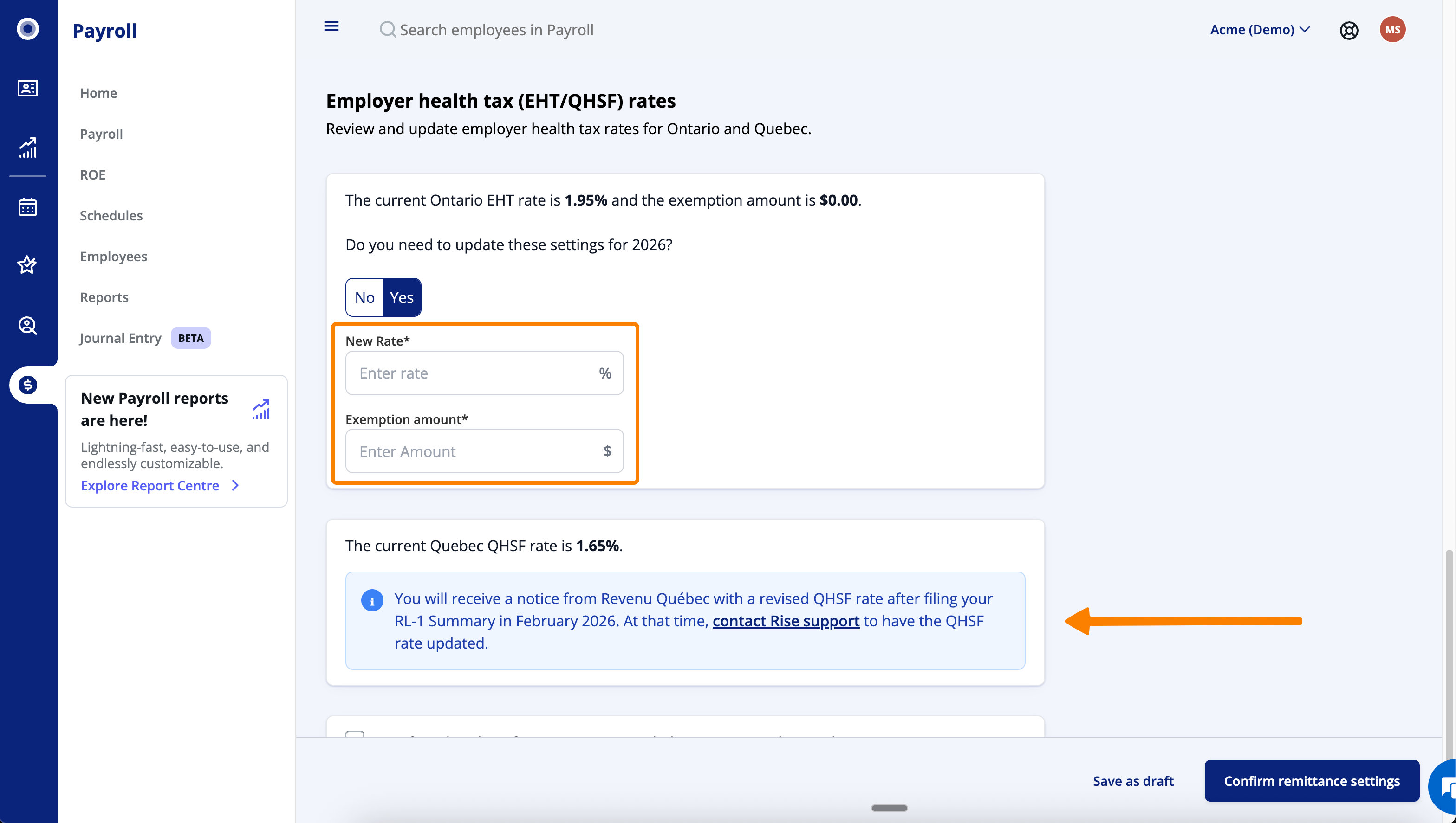 Action Required: When you receive your new QHSF rate notice from Revenu Québec (in the new year), please contact Rise support. Our team will update this rate for you.
