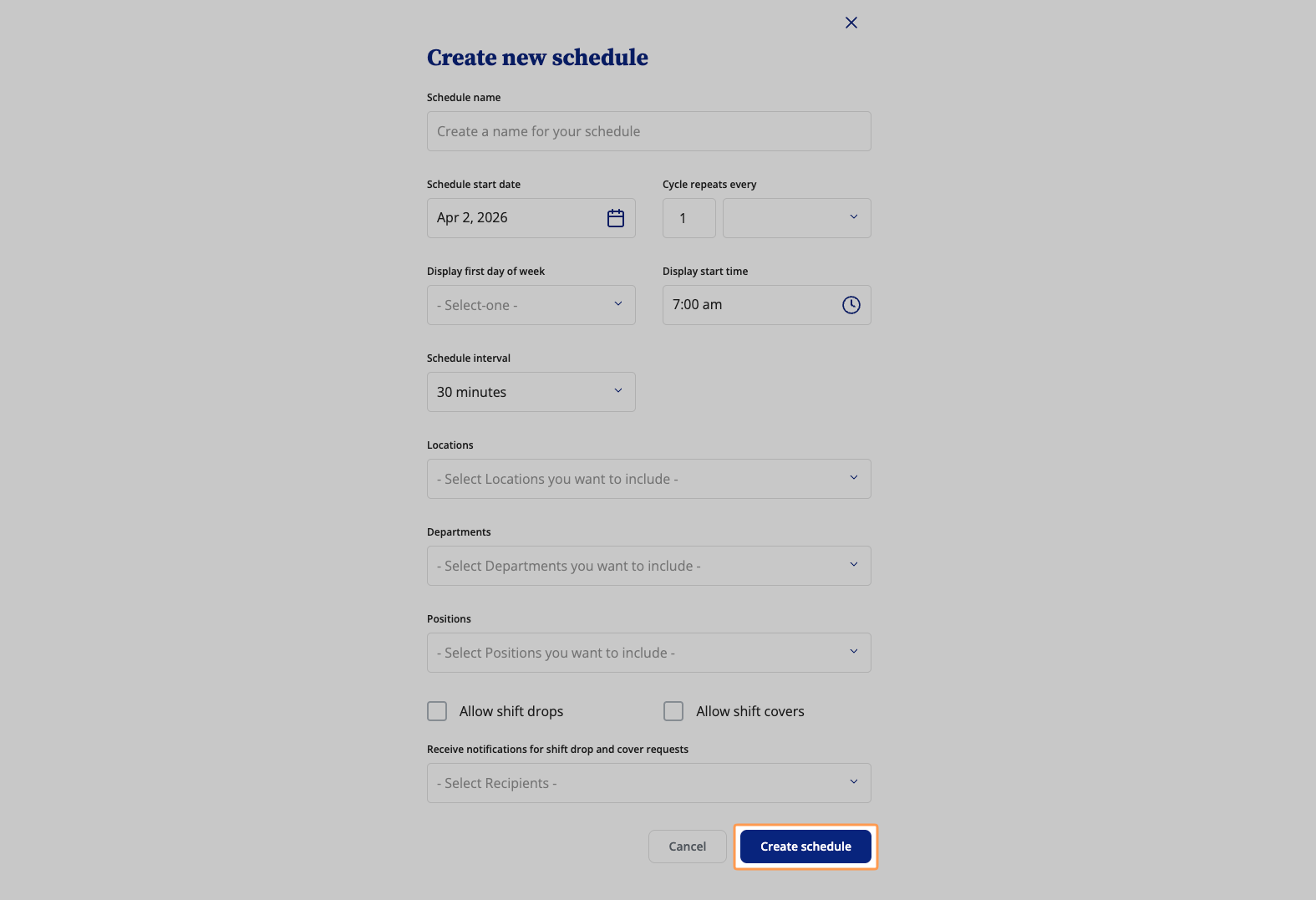Next, enter the required information such as Schedule Name, Display First Day of Week and Departments. The remaining fields are optional.
