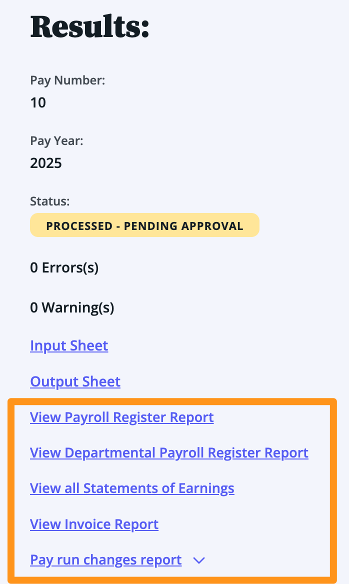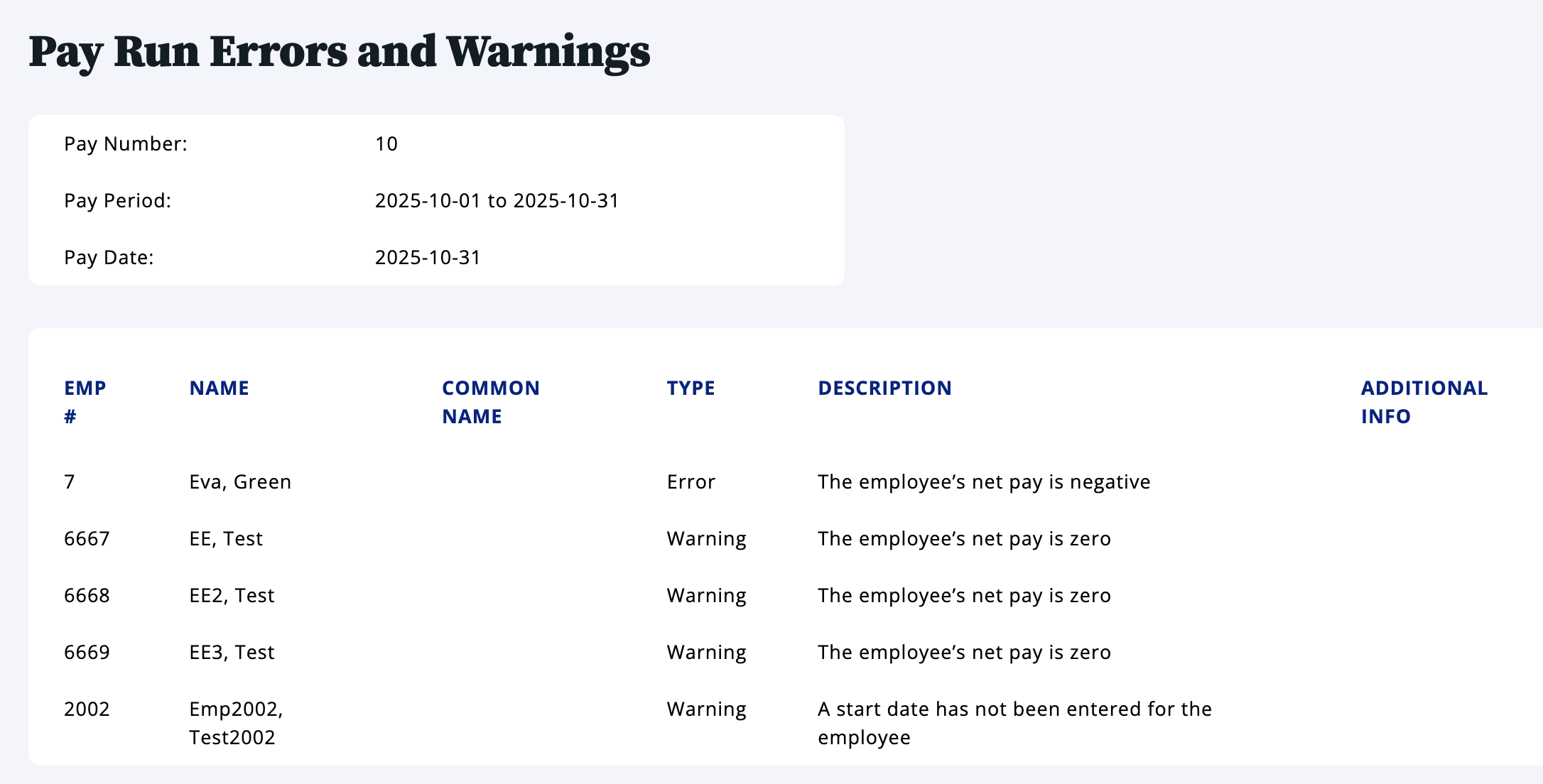 - Errors (Blocked): If an error is present, this will be the only report available. You cannot approve the pay run until the errors have been corrected.