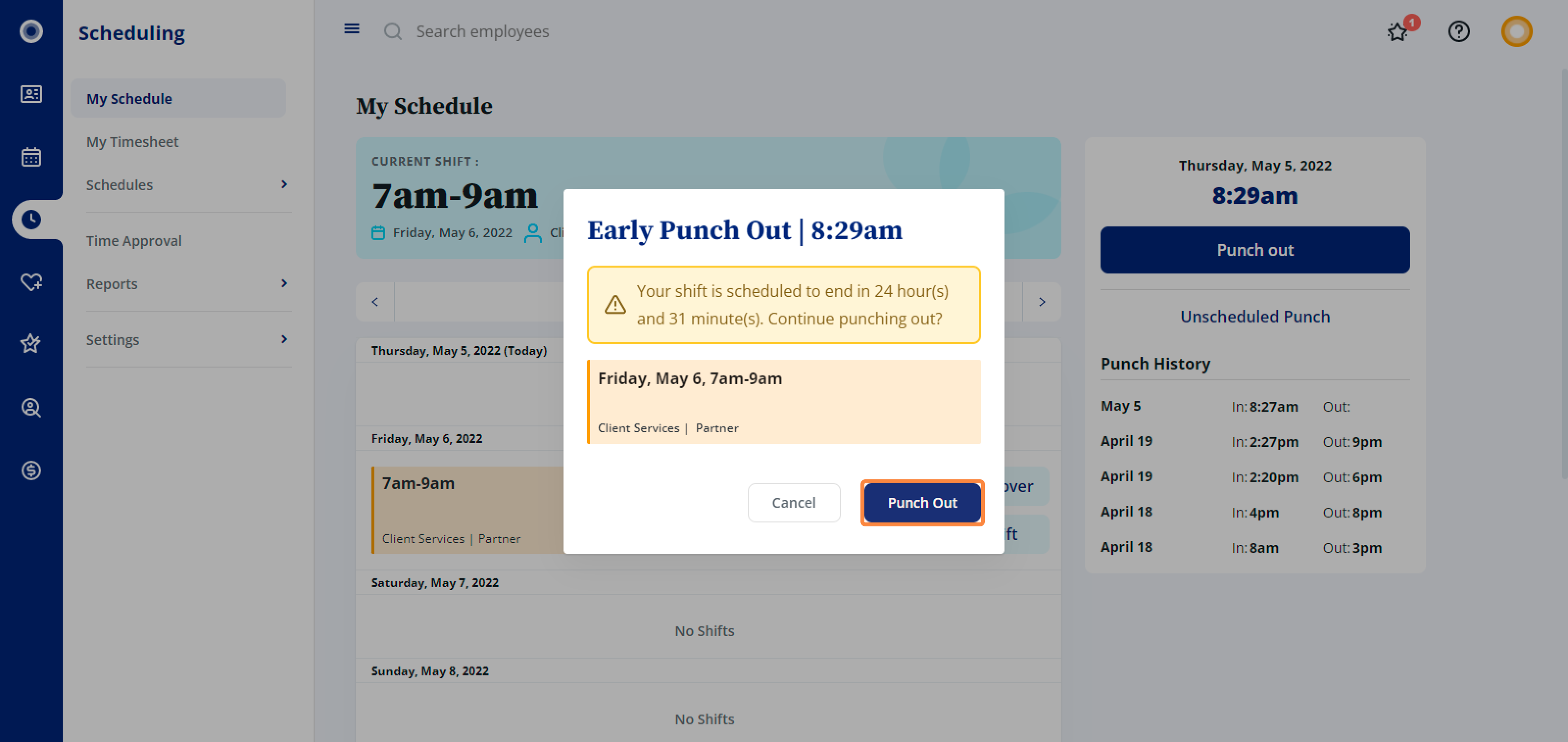 You’ll see a warning message if your punch in or punch out time doesn’t match the shift time. Click Punch In to confirm.