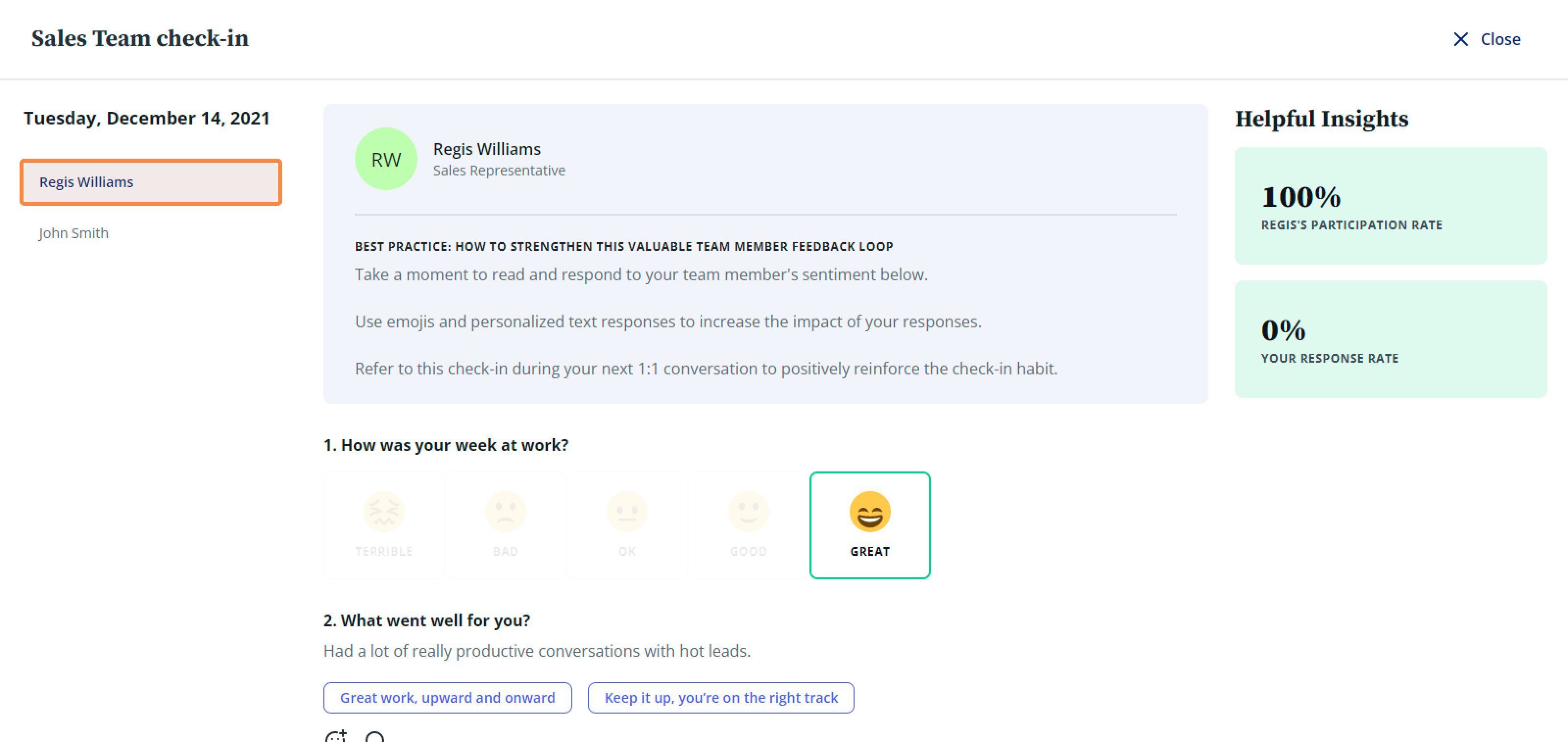 6. When you’ve finished responding to your team members’ check-ins, click Close.