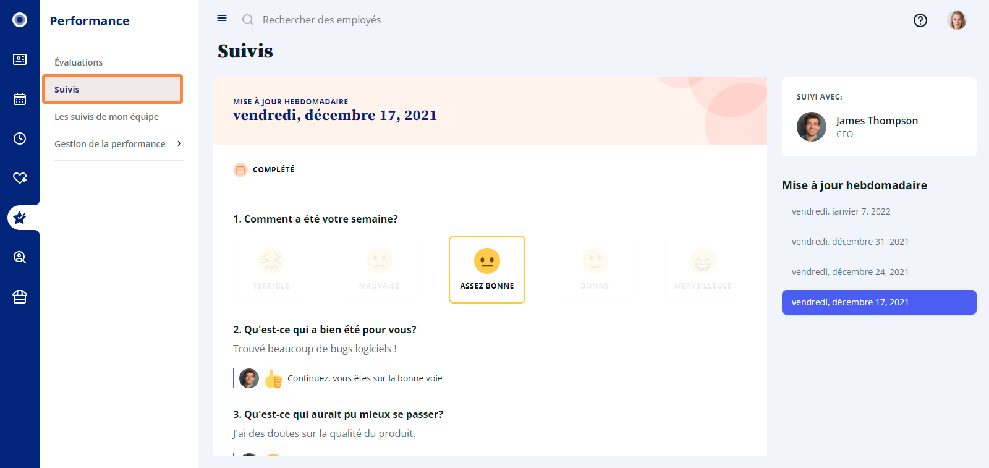 2. Sur le côté droit de la barre de navigation, cliquez sur le suivi pour lequel vous voulez voir les réponses. Vous verrez les réponses de votre gestionnaire à côté de vos propres réponses dans le suivi.
